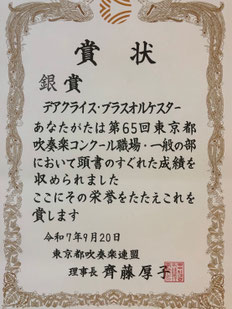 『第65回東京都吹奏楽コンクール 職場・一般の部』にて「銀賞」を受賞いたしました。
